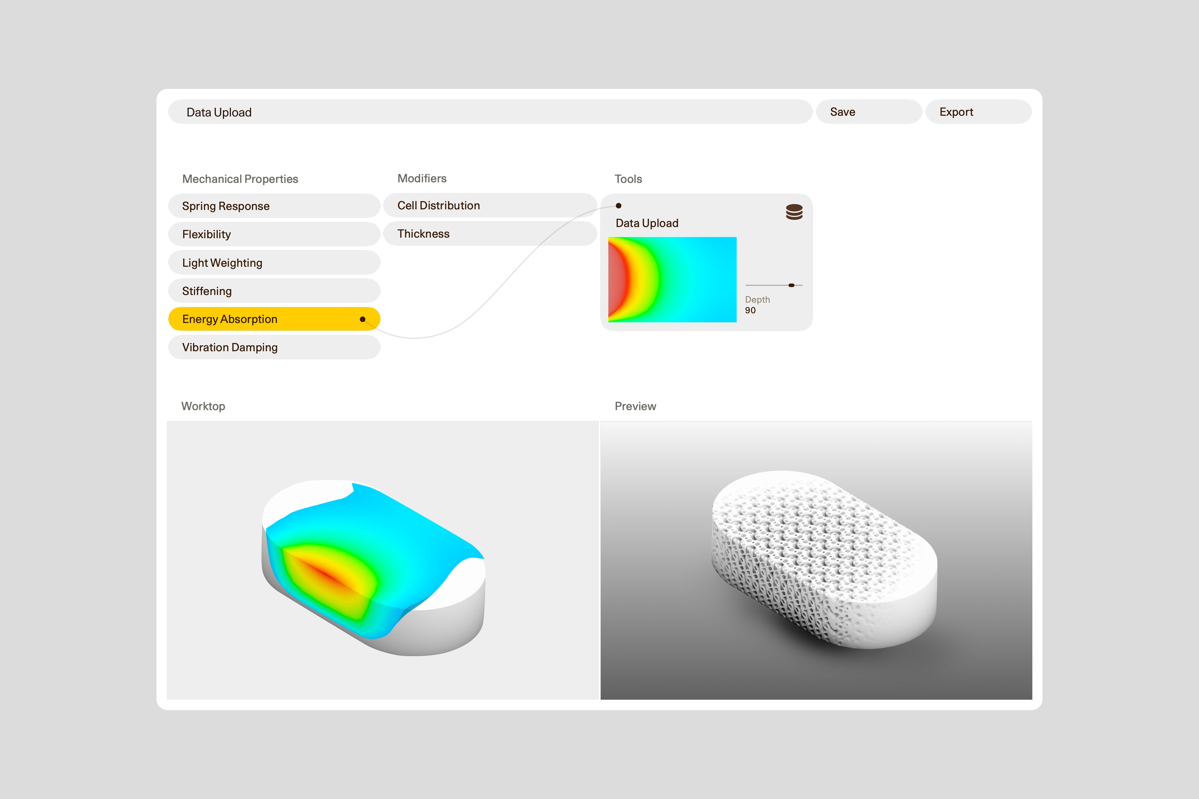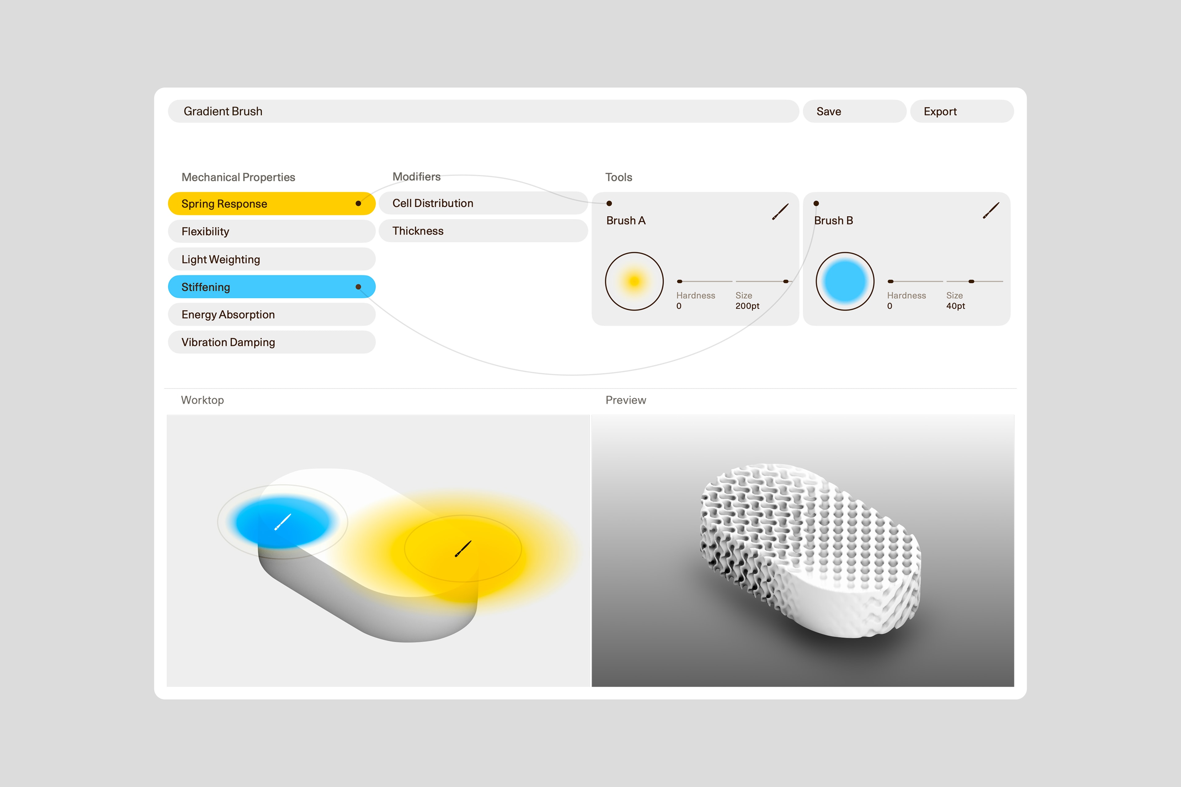 Excited by the potential of this approach, we conceptualised a set of tools to enable different types of designers to play with architected materials. From intuitive brushes for the less technically inclined, to intercepting attractions for creatives in the engineering space, and data uploads for performance-driven profiles, looking to play around with new technology.