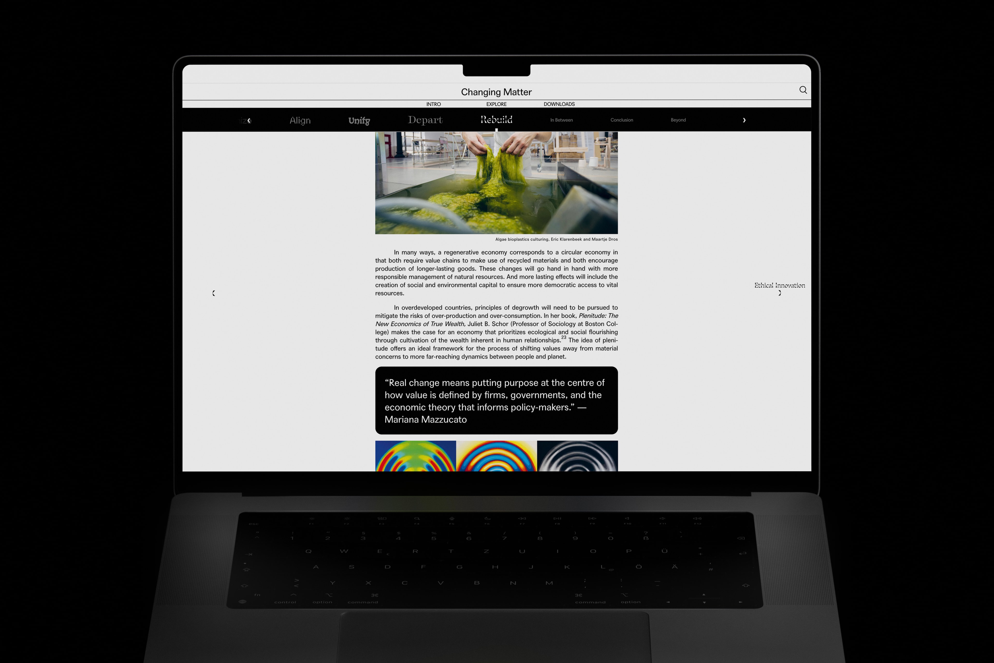 A ‘whole innovation’ catalog, Changing Matter is our contemporary homage to the Whole Earth Catalog. We collated the research, insights, ideas and ideals that drove our own journey towards becoming a more regenerative engineering studio into a non-linear encyclopedia.