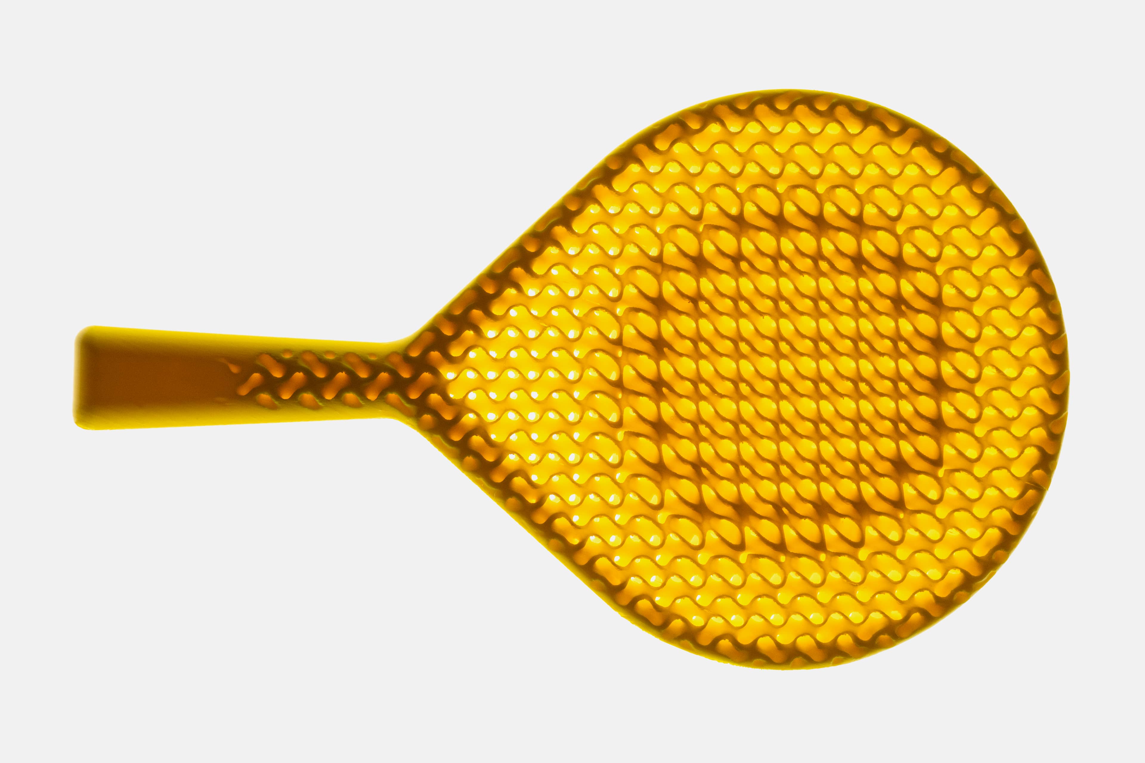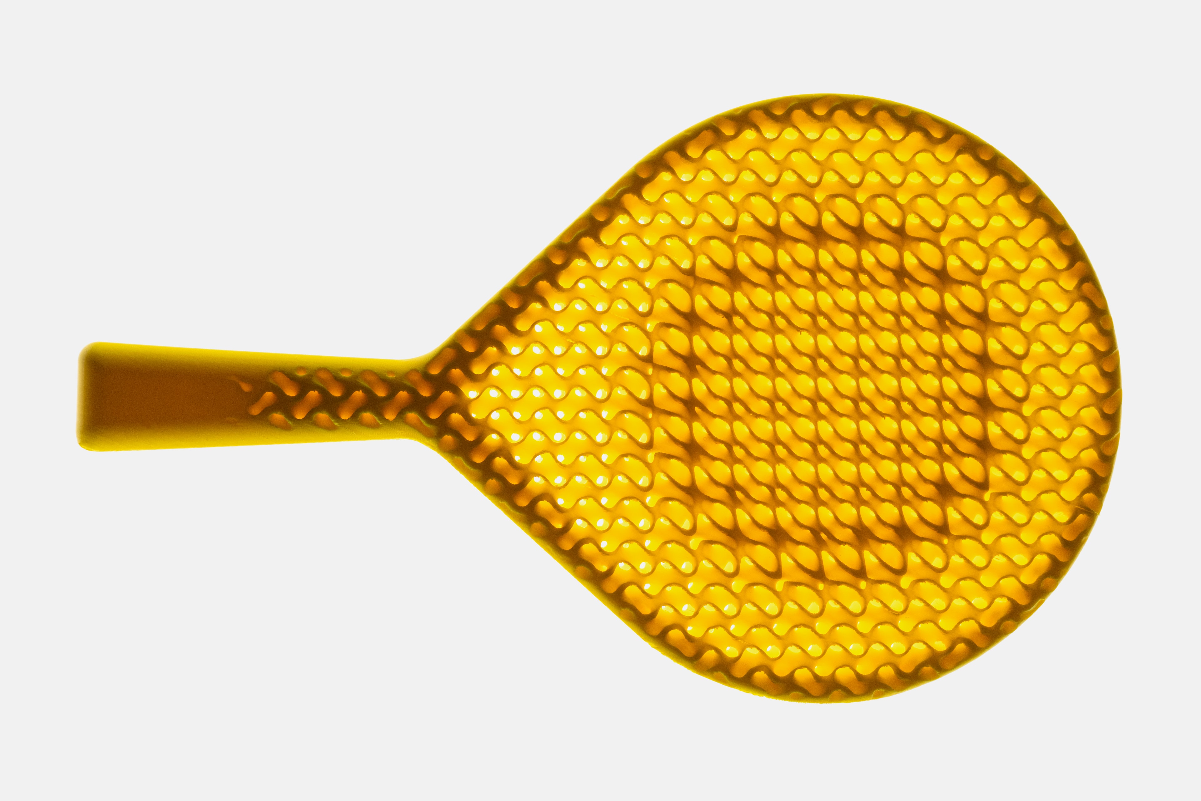 Mono-material racket, resorting to a gradient of structures to achieve springiness, stiffness and light-weighting in a single print.