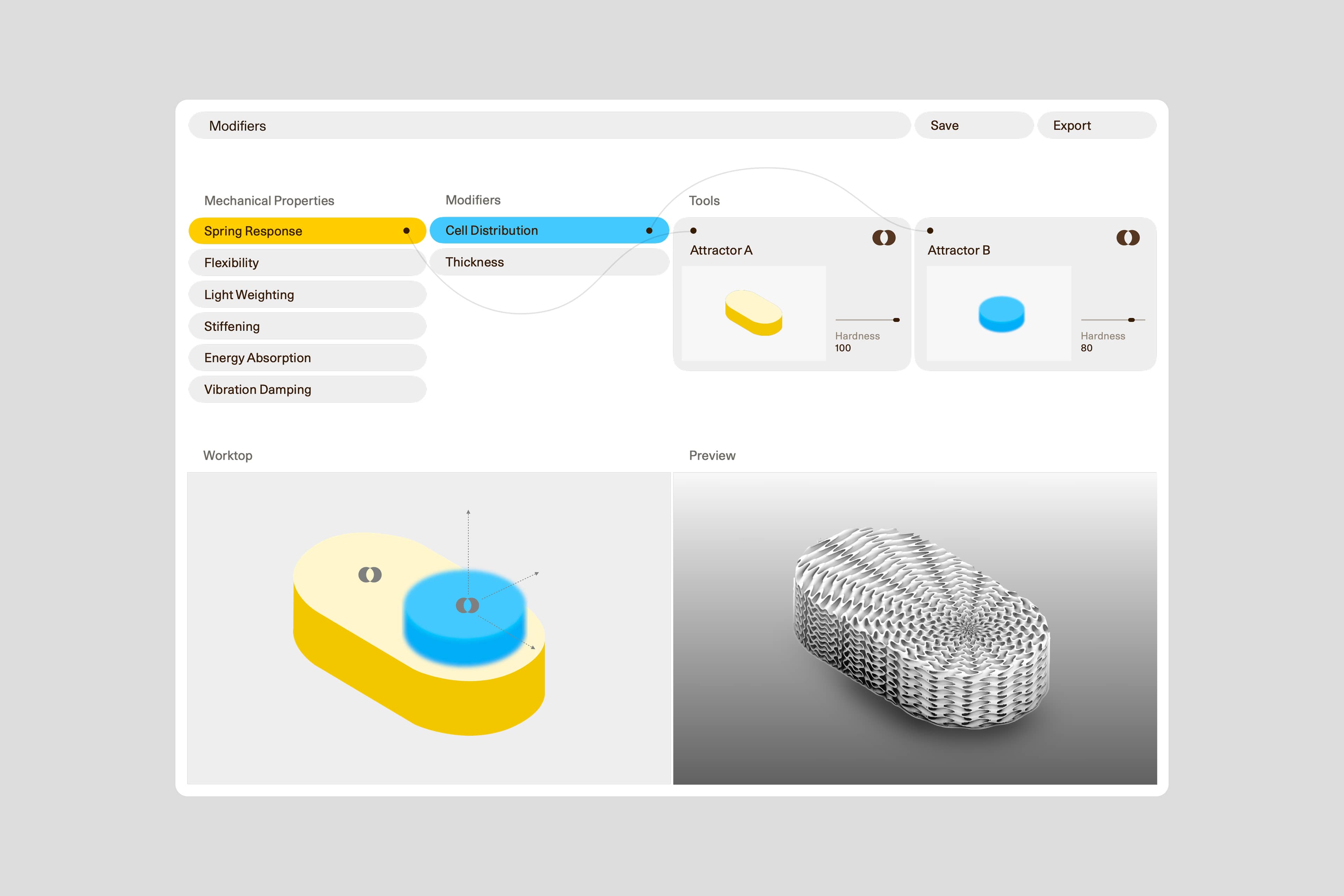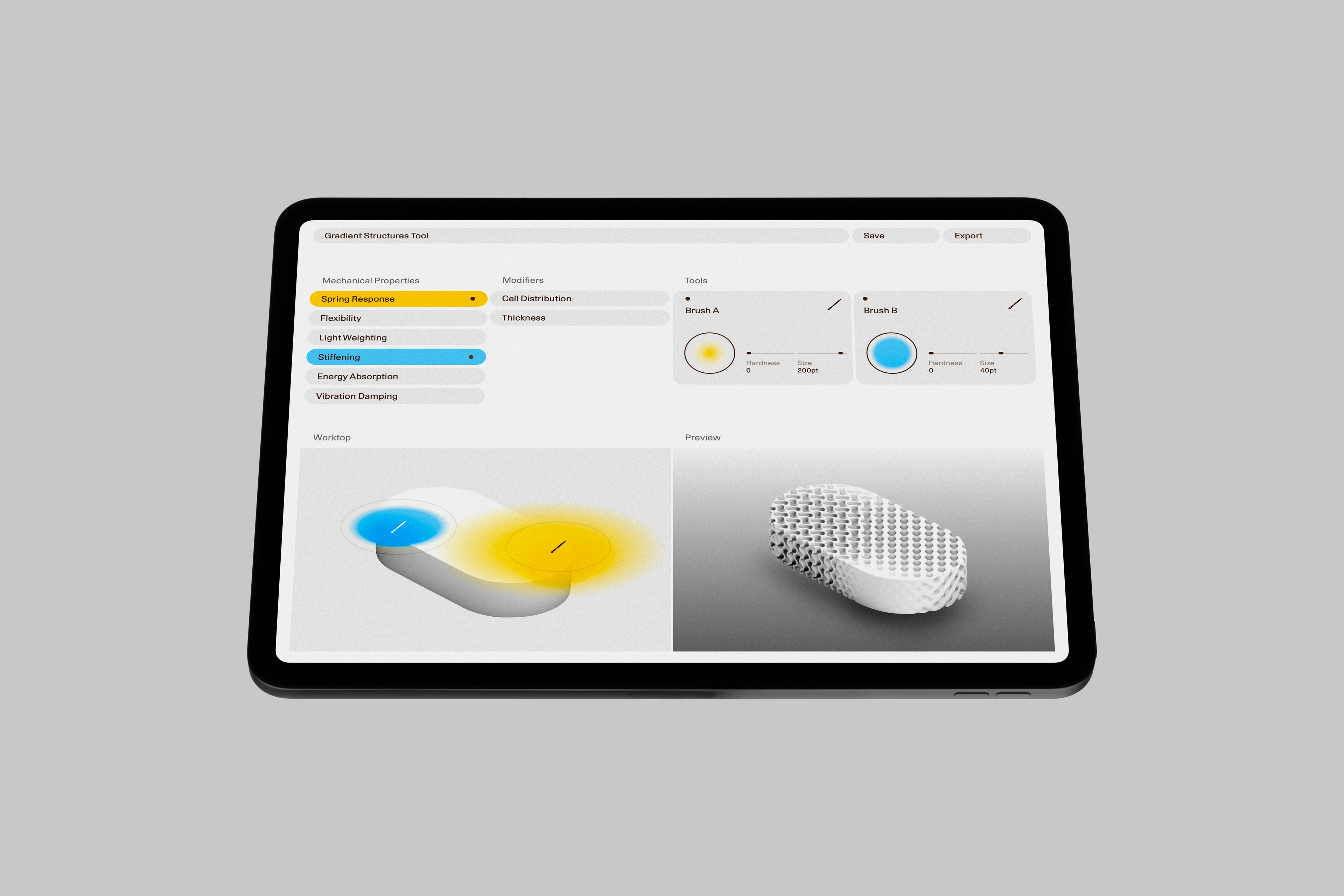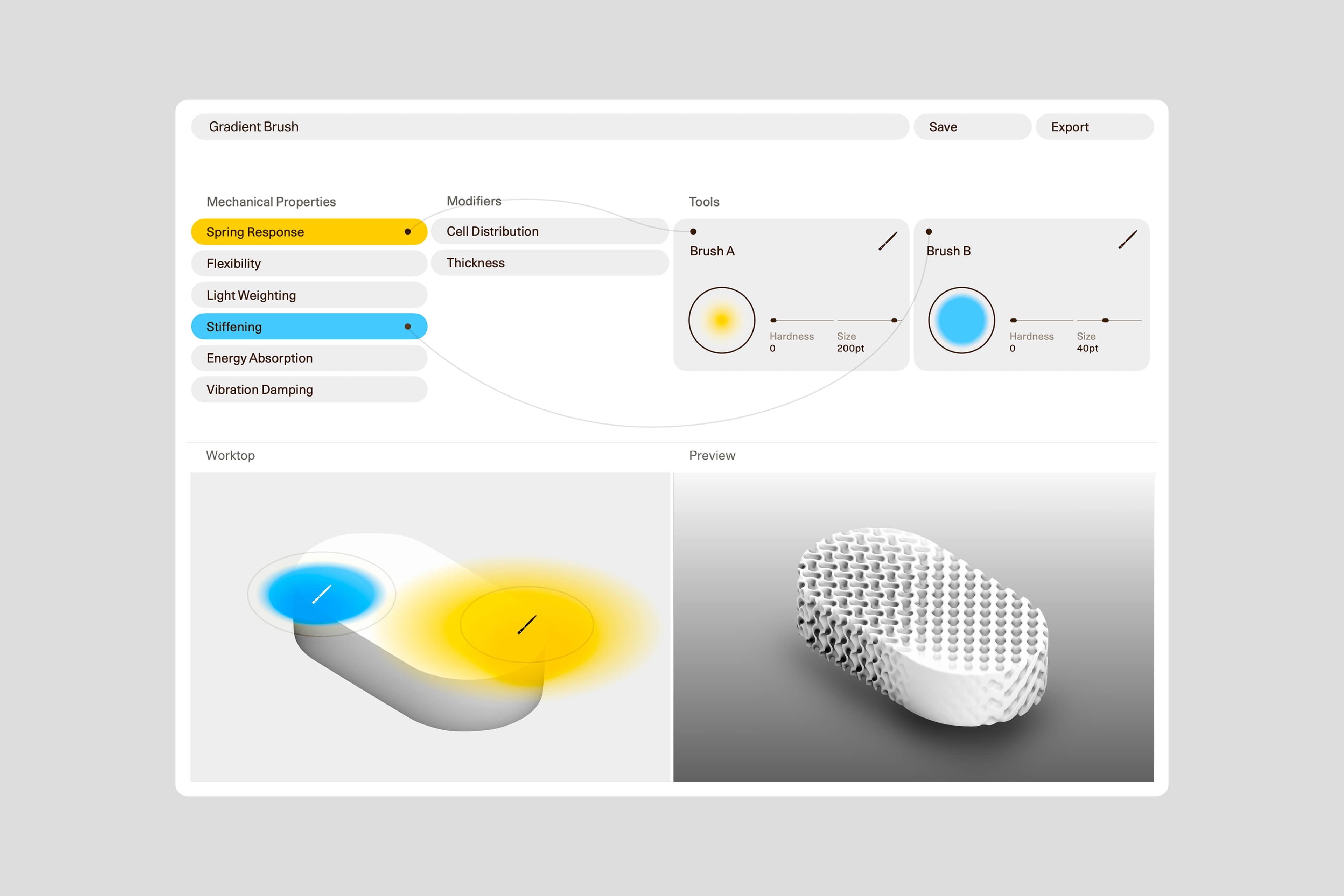 Excited by the potential of this approach, we conceptualised a set of tools to enable different types of designers to play with architected materials. From intuitive brushes for the less technically inclined, to intercepting attractions for creatives in the engineering space, and data uploads for performance-driven profiles, looking to play around with new technology.