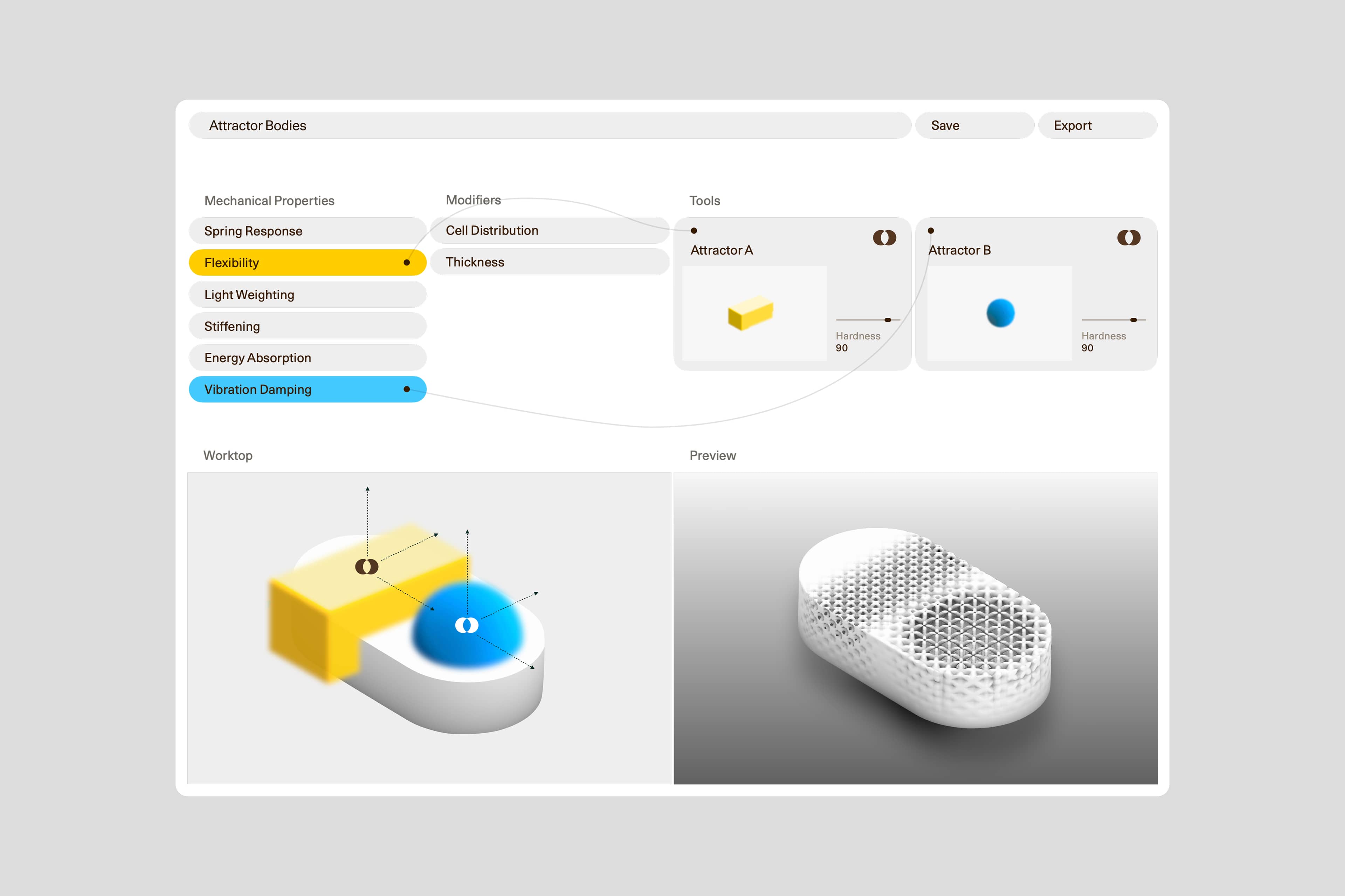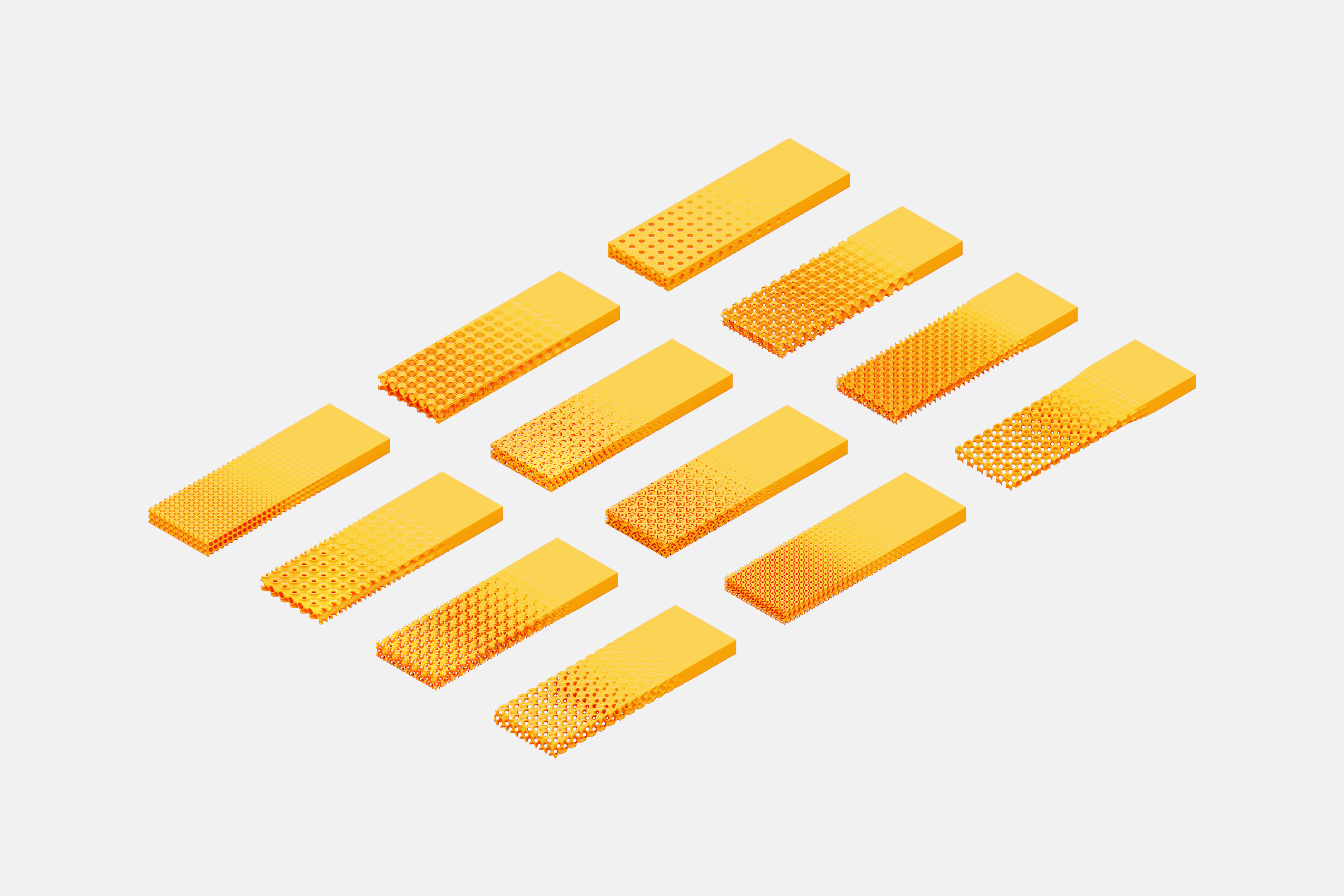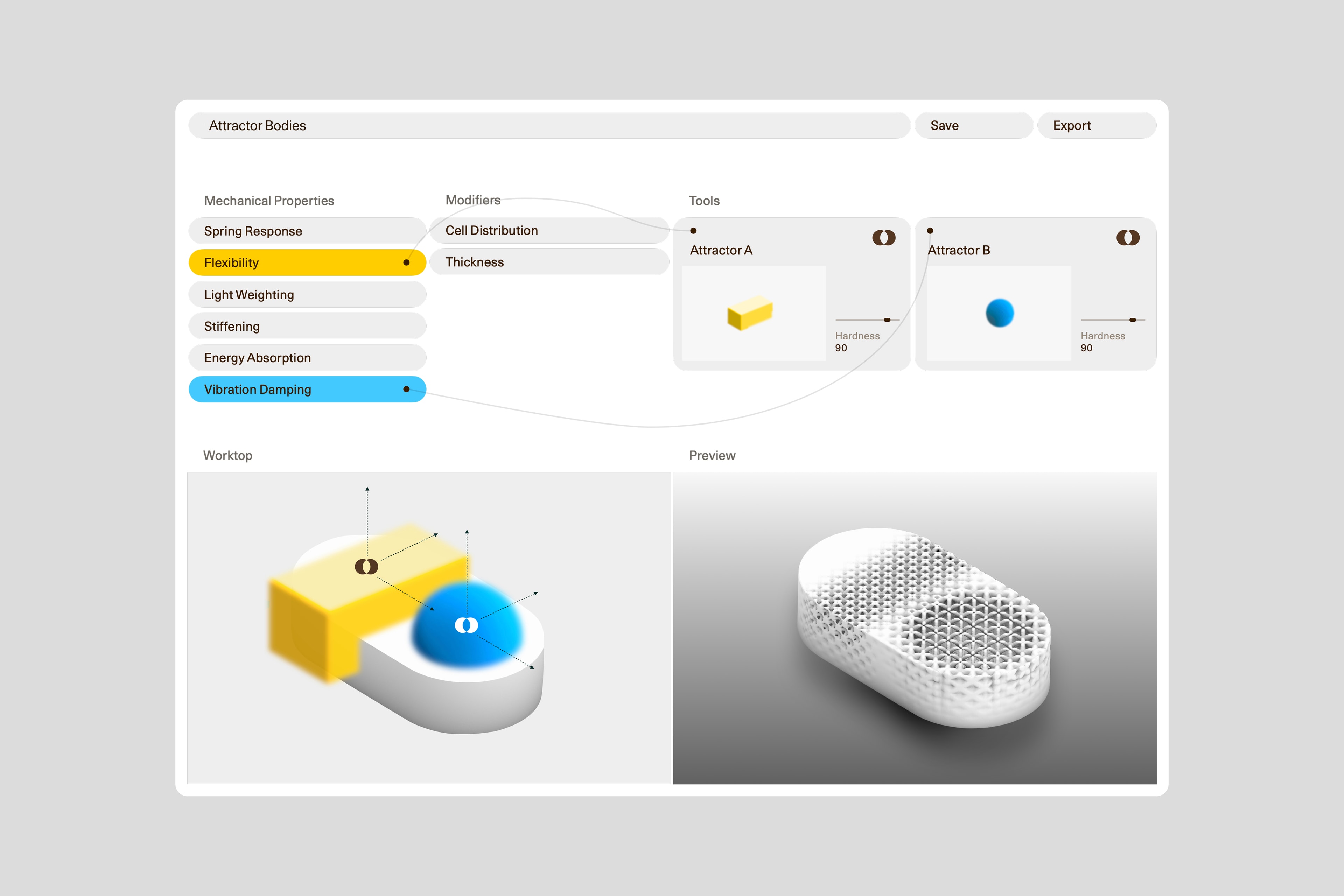 Excited by the potential of this approach, we conceptualised a set of tools to enable different types of designers to play with architected materials. From intuitive brushes for the less technically inclined, to intercepting attractions for creatives in the engineering space, and data uploads for performance-driven profiles, looking to play around with new technology.