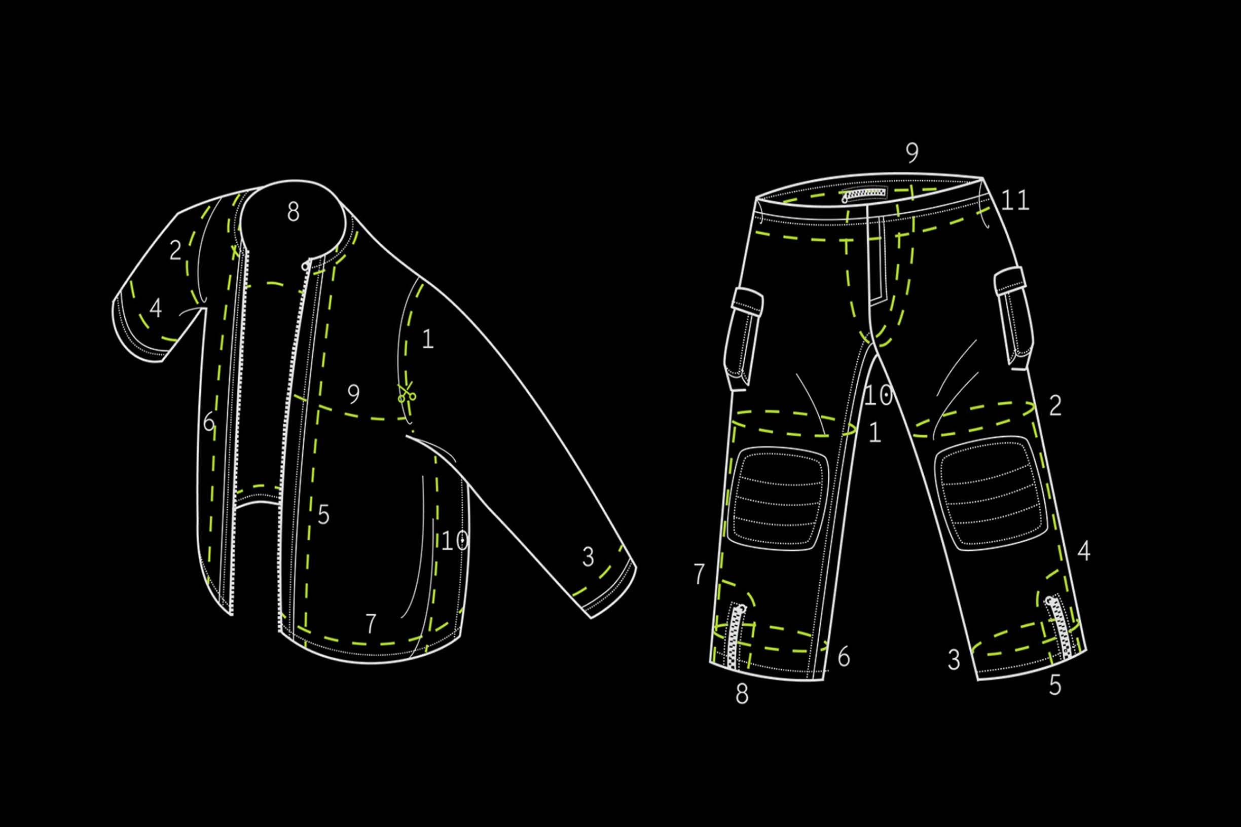 After studying the multi-layered firefighter jacket construction and lengthy disassembly processes, we identified two key points of improvement: The segmentation of the suit into smaller, workable pieces and the removal of the (currently) unrecycleable reflective strips.