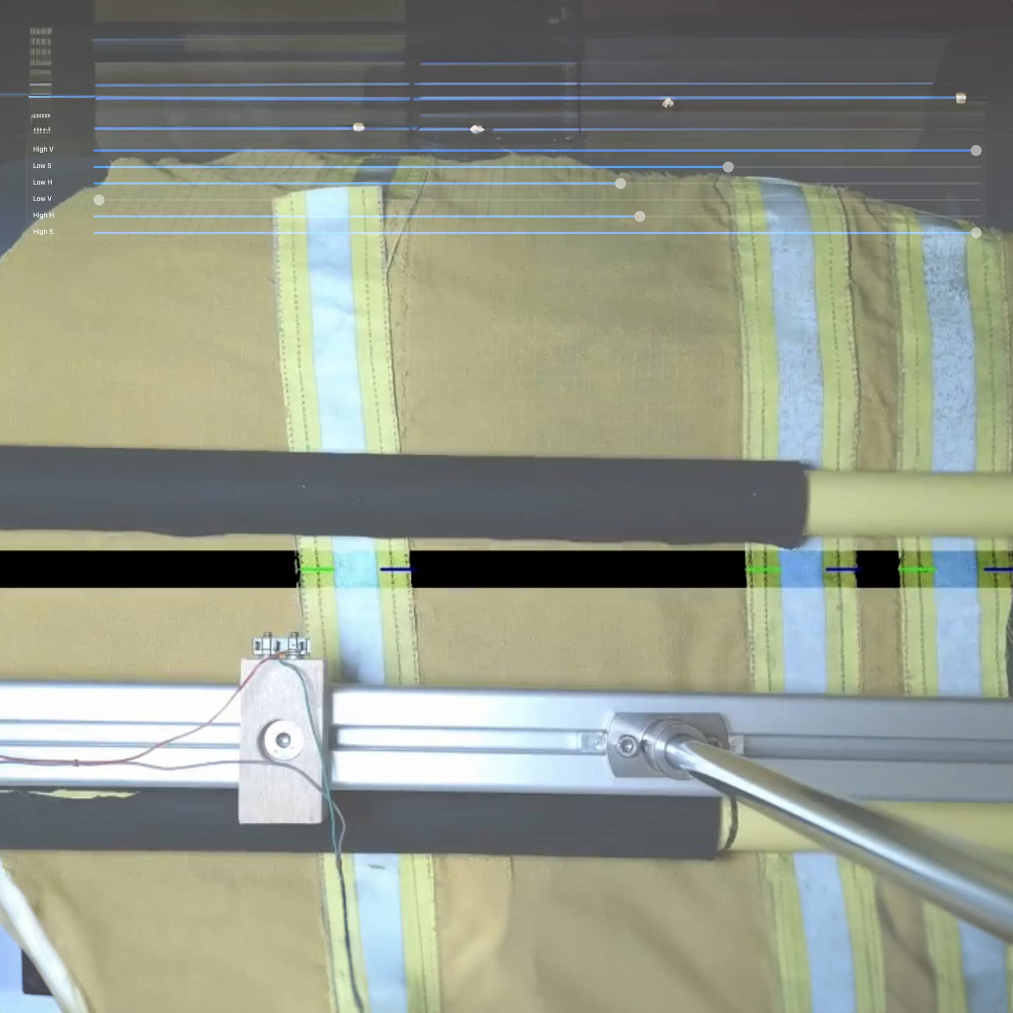 For the pieces of material that have reflective strips sewn onto them, we designed a machine that uses computer vision to recognize the location of the strips and automatically cut through their seams without damaging the fabric below. Once retrieved, the operator can use the table-mounted clamp and hand tools to remove the extraneous strips and place the salvaged material into the sorting bins below.